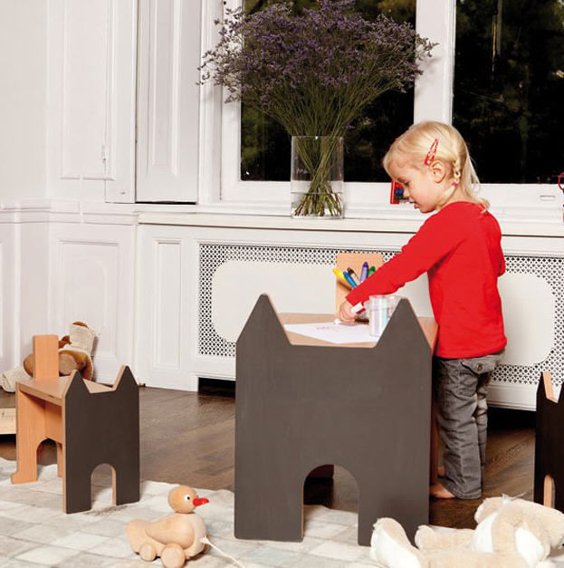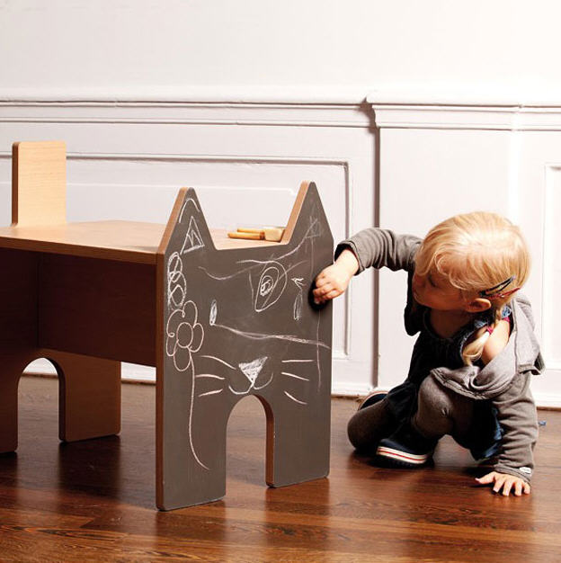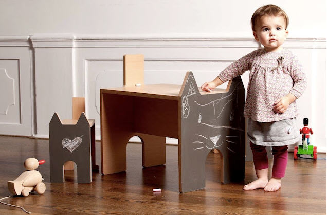 Coup de projecteur de nic nac sur le petit bureau en bois écologique avec une face en ardoise. Brillante idée! Car oui, vos haricots pourront y dessiner sans risquer d’en mettre sur la table du salon! Futé ça!