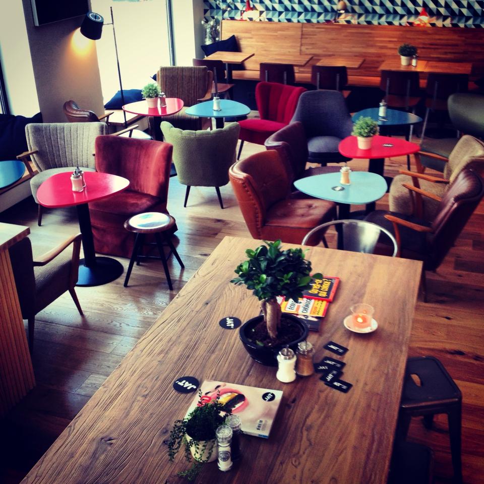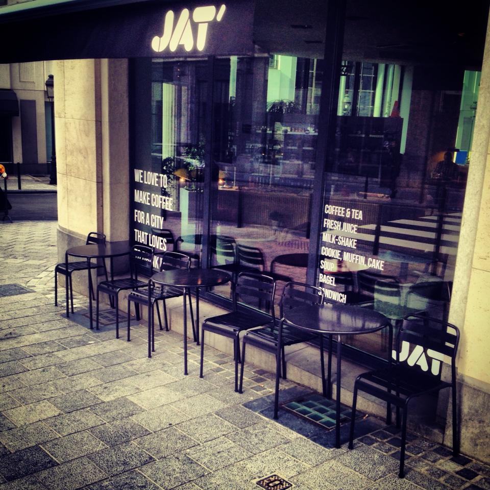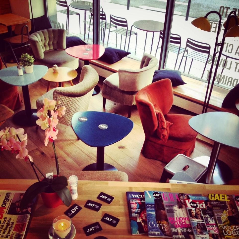 Ce weekend nous a permi de faire une découverte fort agréable pour les gourmandes que nous sommes: le JAT’ café. L’endroit est parfait pour se poser, travailler, papoter dans un cadre très agréable et où on a pas l’impression d’être l’un sur l’autre . Le café est entouré de grandes baies vitrées qui lui donne une luminosité très agréable. La déco est dans la tendance vintage et trendy mais sans que ce soit ‘trop’. On y a gouté les bagels et les jus frais, qui étaient à la hauteur de nos attentes. Vous y trouvez aussi un grands nombre de salades, sandwiches, boissons fraiches, desserts et plein de sortes de cafés (chauds, glacés et frappés).Une très chouette adresse dans un quartier sympa. Ideal pour faire une pause pendant votre shopping ou pour manger un bout avant d’aller voir une expo au BOZAR.