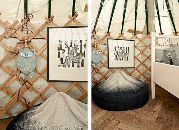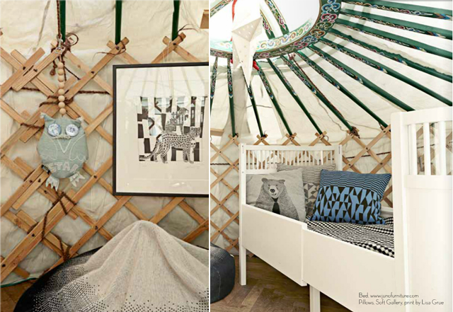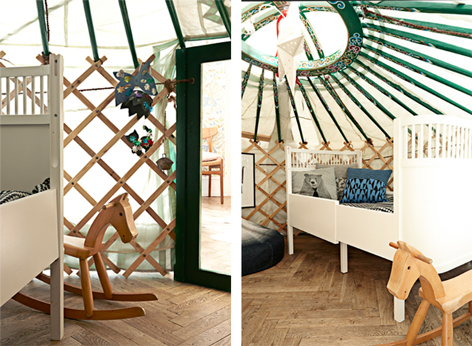 On avait déjà vu les tipis, les tentes, les cabanes dans les chambres de nos haricots… mais c’est bien la première fois que nous voyons une Yourte. Elle est plus intime qu’un lit cabane, et plus spacieuse qu’une tente, elle apporte une nouvelle dimension qui feraient de nombreux heureux ! C’est L’illustratrice Lisa Grue qui a eu cette idée brillante. Déjà connue pour son travail d’artiste/illustratrice souvent encadré dans les chambres de nos haricots et visible dans de nombreux magazines de décoration. Son idée a donc été d’installer l’habitat traditionnel des nomades mongols dans une chambre d’enfant pour une incroyable invitation au rêve et au voyage. « Une tente comme celle-ci stimule encore plus l’imagination de Mika” explique Lisa Grue en parlant de son fils qui vit au cœur de Copenhague.