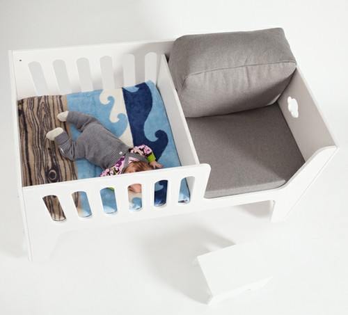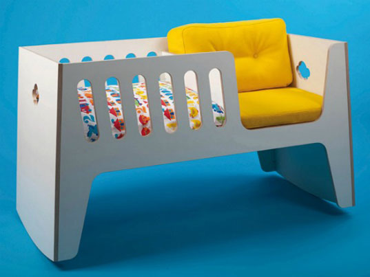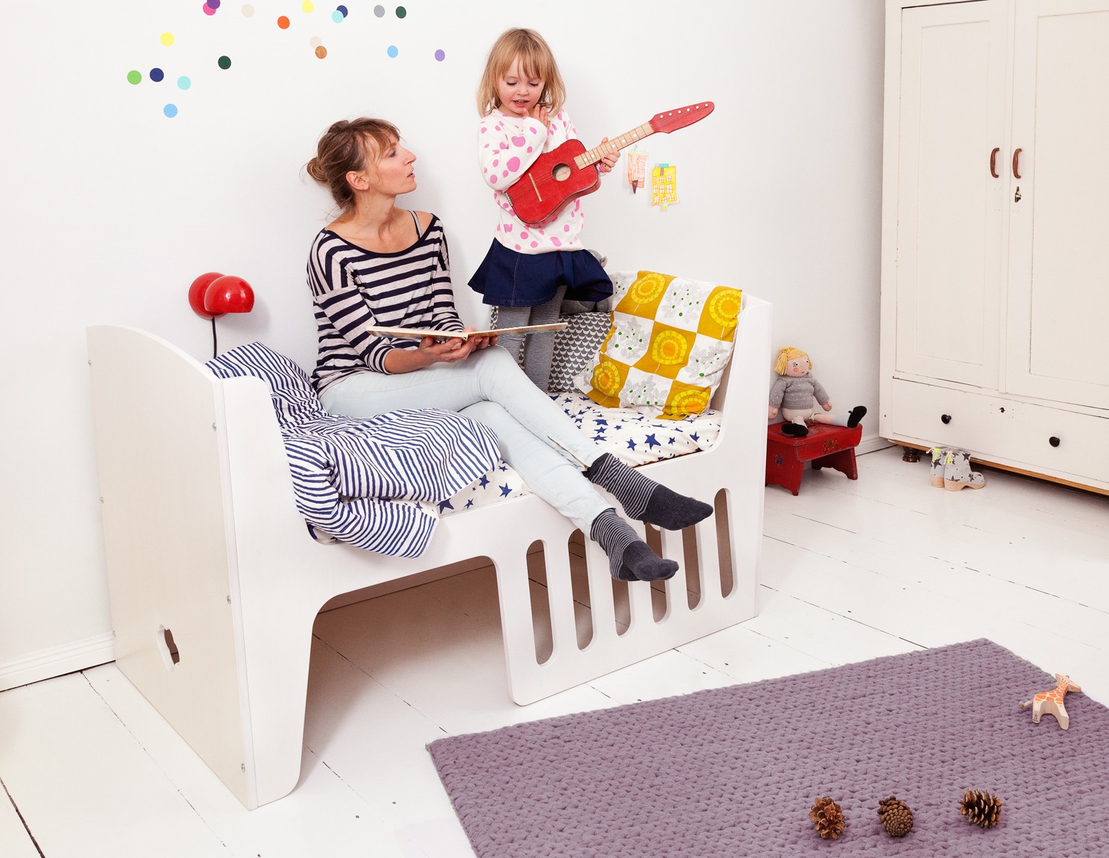 Named Rocky, this exceptionally well designed modular cradle: is a piece of furniture with long usability, as it adapts to the growth and needs of an active child. At first it is both a cradle for baby, and a rocking-chair for parents, combined into one. As the child grows the cradle can be rotated 180° and turns into a children’s bed with a length of 140 cm. Use the bedrail as a boundary for greater safety. These images show all stages of using the convertible Rocky bed by jäll & tofta. Use it as a rocking chair, a cradle, a crib, a childrens bed or as a cave to hide in it! One hell of an invention! Check out the video to see how great it is.