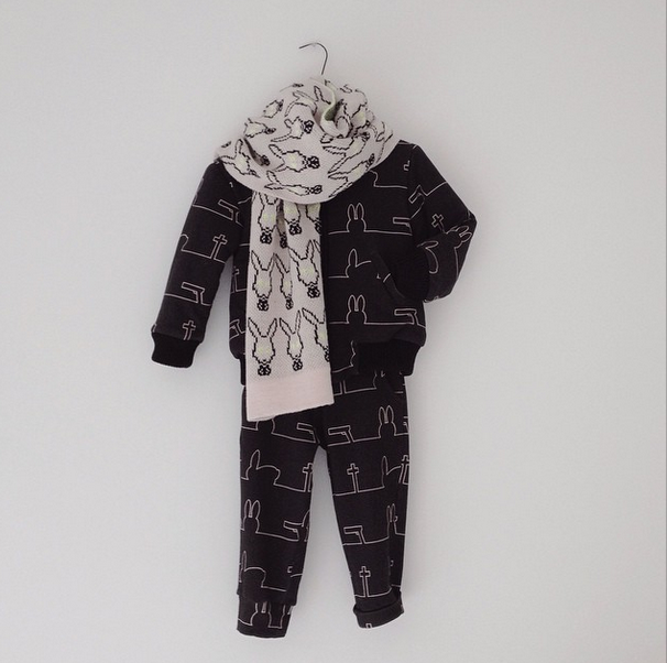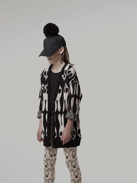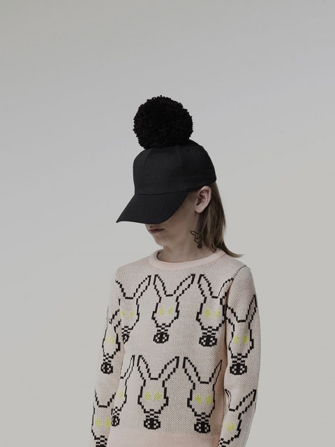 Caroline Bosmans, est une maman de quatre haricots et une créatrice de génie, proposant une collection de vêtements pour haricots super graphique et singulière. Sa signature? Une casquette noire unisexe ornée d’un énorme pompon et un lapin très Donny Darko. C’est sobre et très avant-garde. Les frontières entre garçons et fille sont brouillées, c’est épuré et un peu sombre. Mais c’est révolutionnaire et nous, ça nous plaît ! Ce n’est d’ailleurs pas pour rien que Caroline Bosmans a été récompensée par MILK durant le salon Playtime de cette année. Que ça vous plaise ou non, habituez-vous à lire son nom dans les mois avenirs, car le monde de la mode se l’arrache ! Les pièces de ( C R L N B S M N S ) sont vendues dans le monde, dans plus de 30 boutiques et concept stores qui vendent aussi et notamment Comme des Garçons et filles à papa..