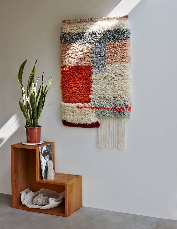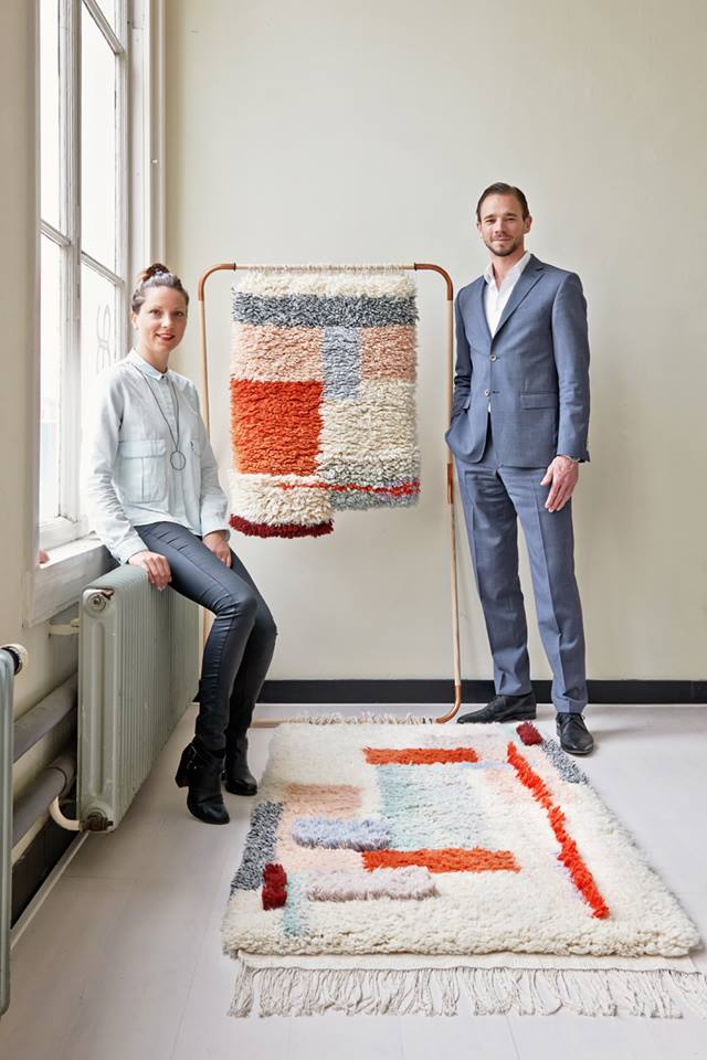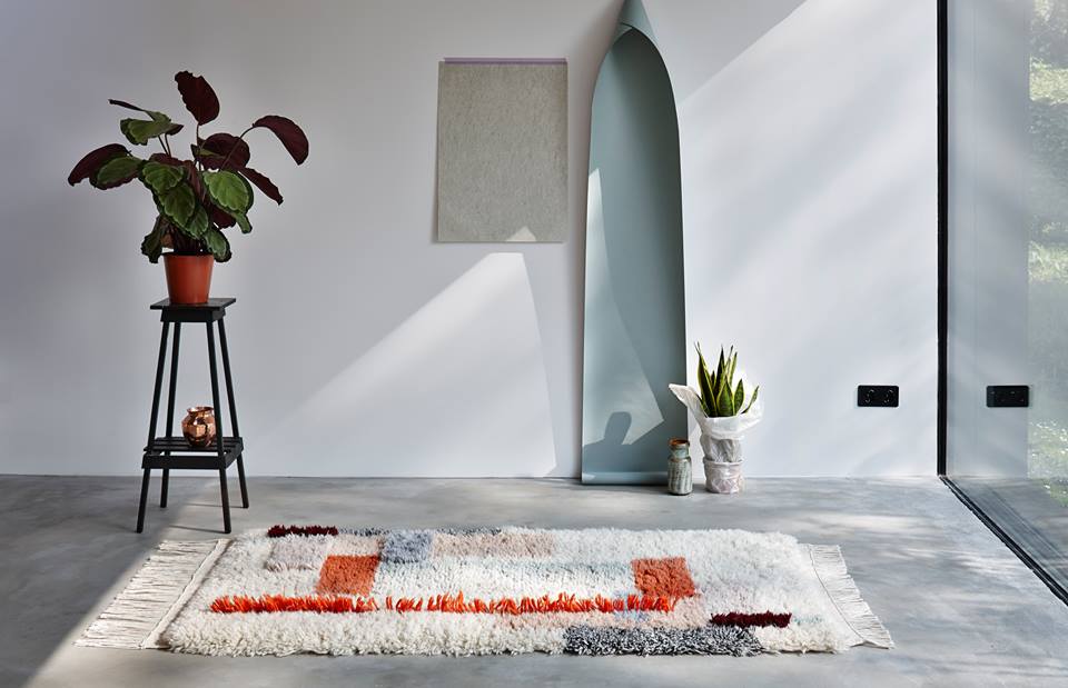 Mae Engelgeer is a textile designer from The Netherlands. Her studio is located in the city center of Amsterdam looking out over the canals near Kadijksplein. This is the place where she designs her collections and where the finishing of the products takes place by giving them a label, hangtag or signature stitch in pop-color orange yarns. One thing immediately stands out in Mae’s approach to design: she isn’t afraid to show color. Her approach to design and her working method is really instinctive, sensory and natural. Her work can be described as fresh, modern and eye-catching. For her it is really about the ‘feel’ of a fabric and she tries to ‘bring a fabric to life’. Mae Engelgeer has a background in fashion (Amsterdam Fashion Institute) and autonomous arts and design (Sandberg Instituut), which adds up to a versatile education. Underneath this diversity runs a very clear thread, a heartbeat of ikat patterns, a close collaboration with the TextileLab, and of course the baseline of pop coloring. All of those elements emerge from Mae’s intuition, ultimately coming together into a unique sensible whole. Inspired by the Berber and Boucherouite style carpets with knotted and heavy wool feel, she designs, among other textiles, amazing rugs and wall rugs. Playing with different heights and loops, color fades and color blocks resulted in two playful, soft toned designs. Produced by Marc Janssen in a factory in Nepal, using 100% wool and the craftsmanship from traditional hand knotting. For anywhere at home: living room, kids room and bedroom… WE LOVE IT!