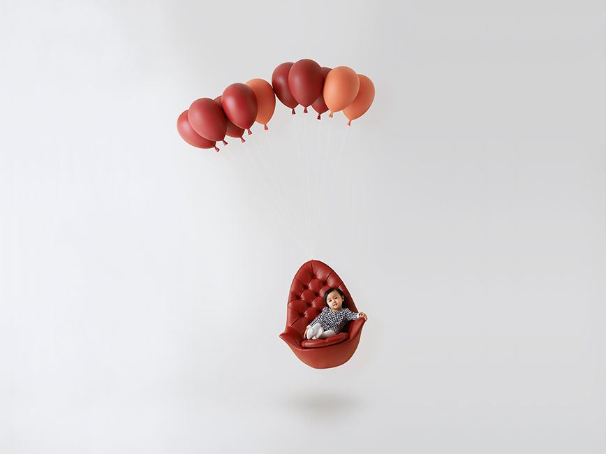 This chair was visually inspired by feelings of floating that the main character felt in the French movie, “Le Ballon Rouge”(1953). A balloon seems to really lift a chair by fixing balloons and a chair to the back wall and realizes a feeling of floating. In addition, the balloons are made of FRP, so they cannot be deflated and blown up. If you sit on this chair, you’ll be able to think positive thoughts even if you are feeling down.