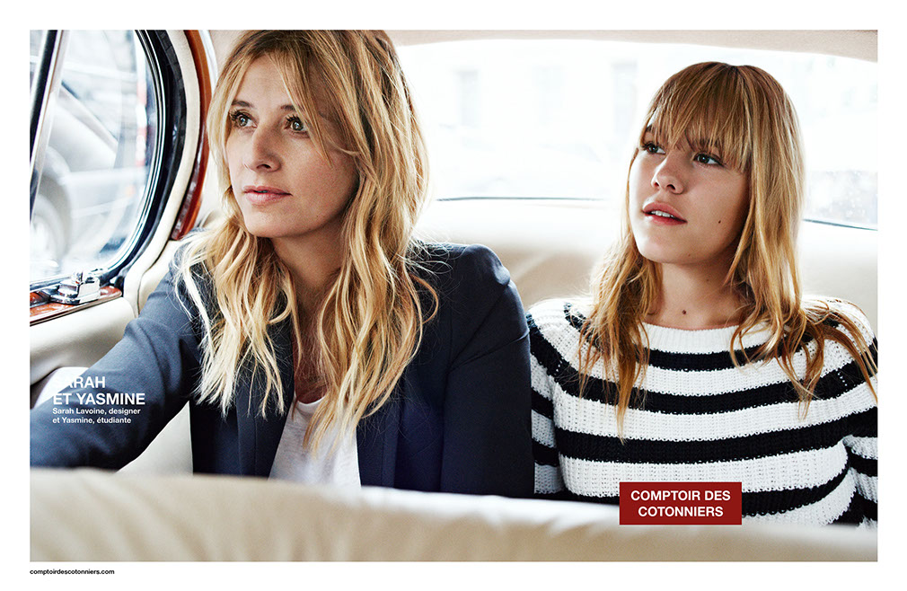 Comptoir des Cotonniers relance ses célèbres pubs consistant à faire poser un duo mère/fille côte à côte dans une même campagne. Pour cette reprise, la marque française a fait appel à Sarah Lavoine, designer reconnue et épouse de Marc Lavoine, et à leur fille Yasmine. Et donc, pour sa campagne printemps-été 2015, c’est ce due qui représente la marque. On aime ! ^_^