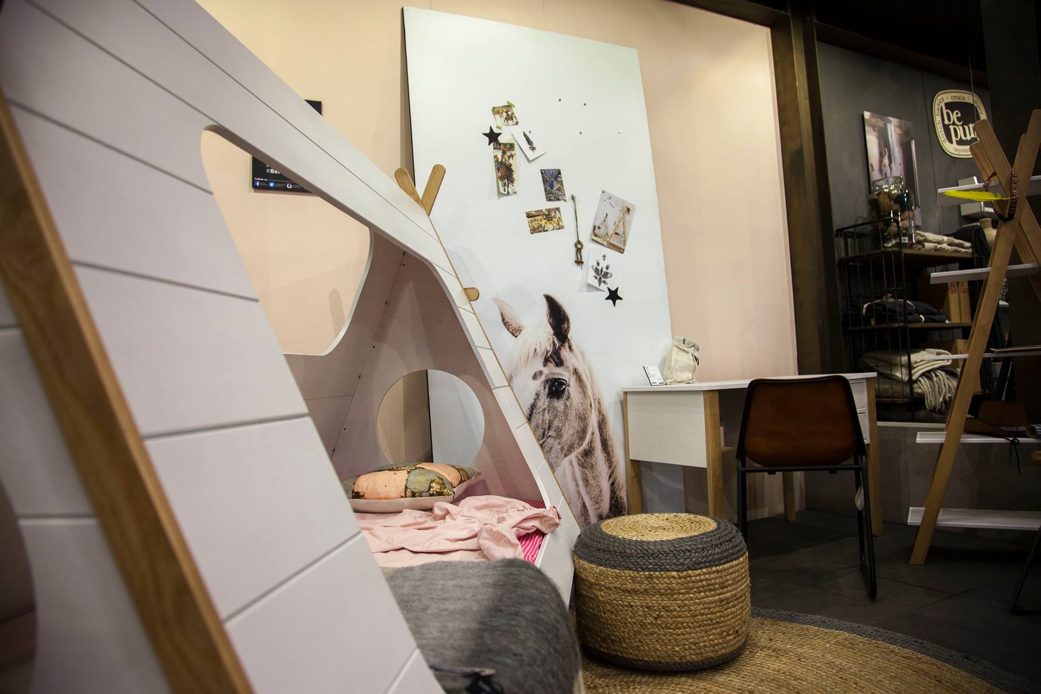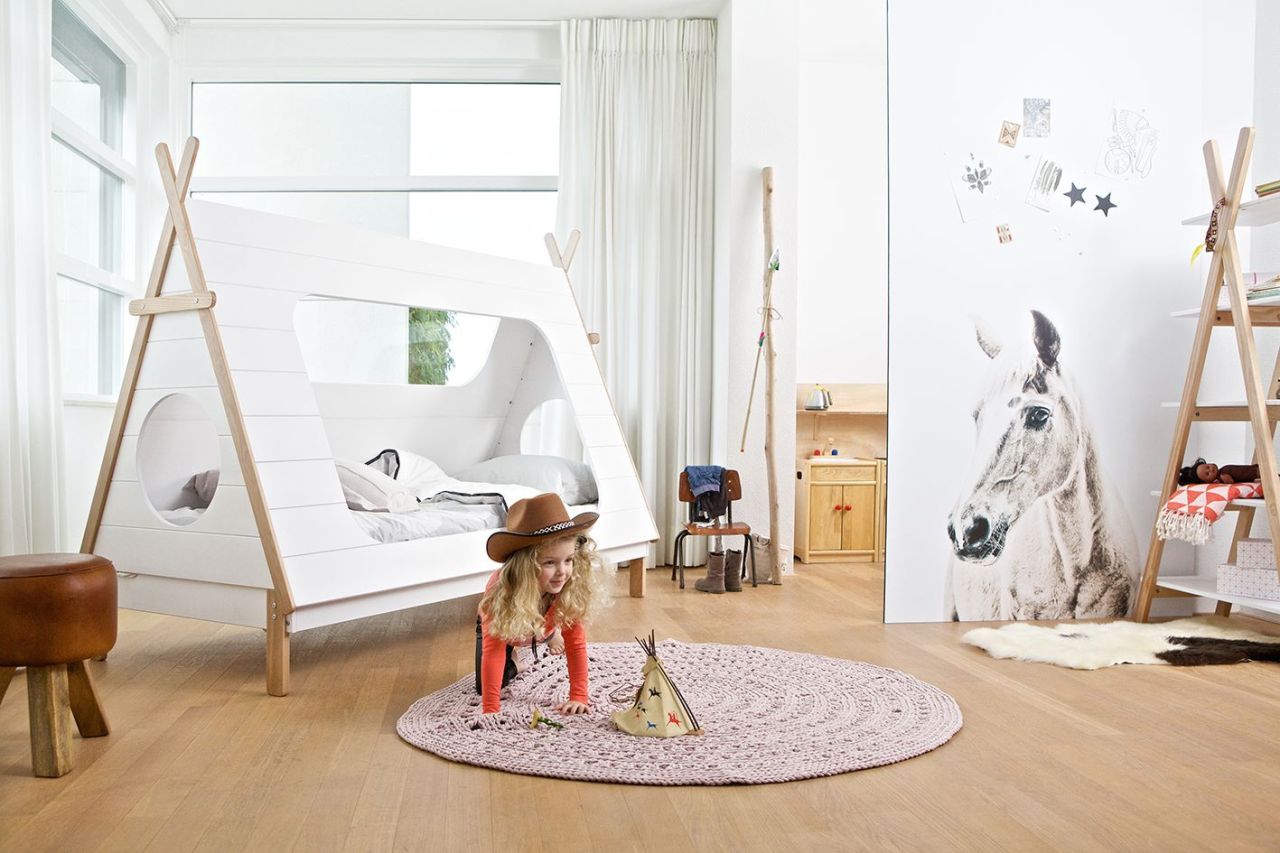 The Dutch brand Woood has been designing, producing and distributing high-quality solid pine, birch and oak wood furniture. They create cute kids’ furniture with simple lines and high quality. It’s obvious that you will fall in love with the original teepee bed in the first picture. There are lots of children’s beds with different ideas, but we love these spaces which can be used to play during the day and to sleep at night. It’s like a mini refuge in their own room and there is a lot of open space to control everything. Its simple shapes and its basic tones make it suitable to every style.