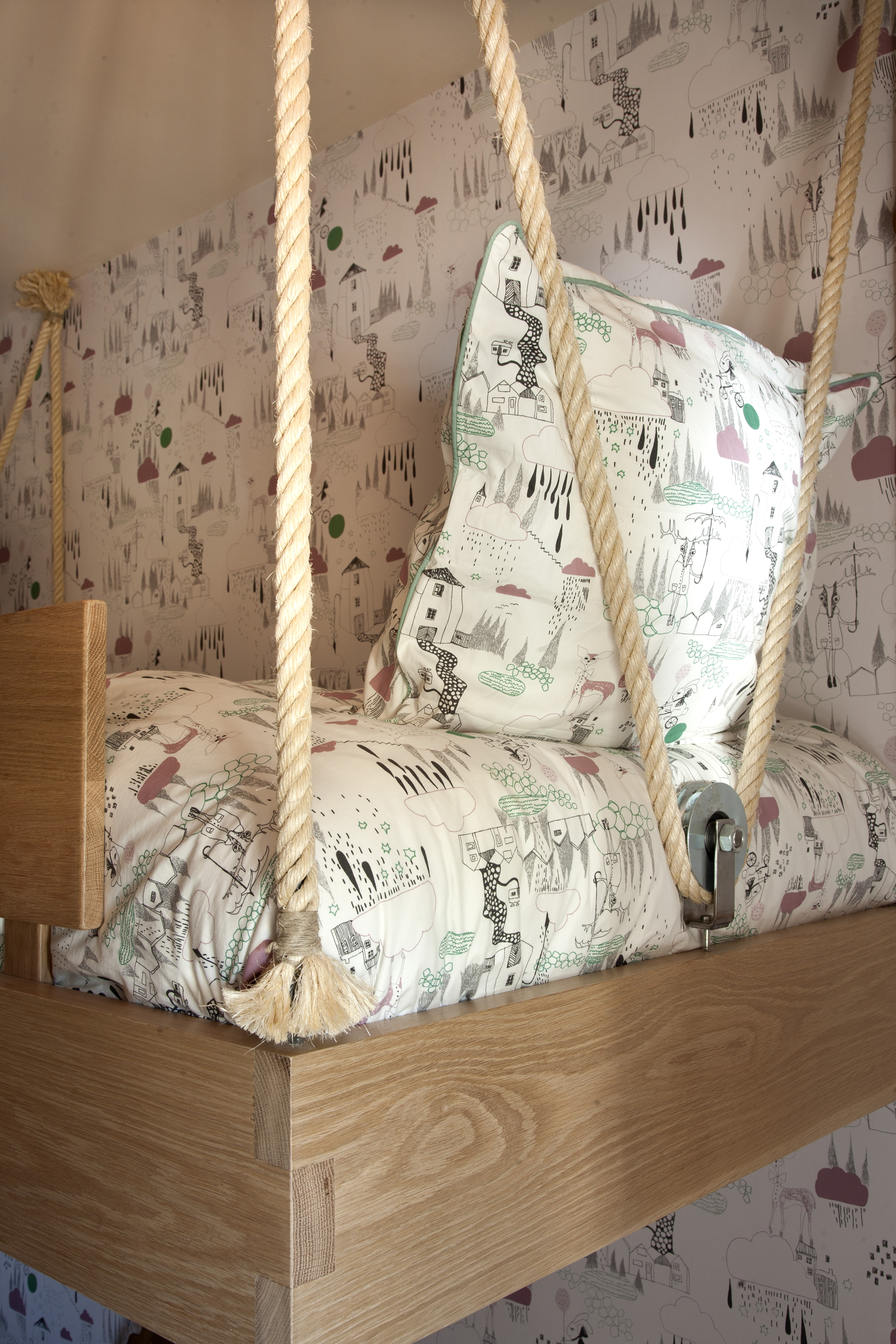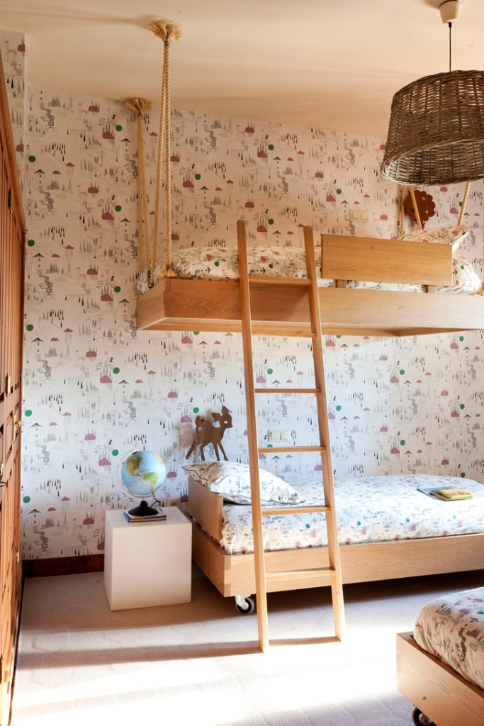 Look at this amazing room for kids with hanging bed! An wonderful idea to take advantage of the space without using typical bunk beds. This room is a project of Bárbara Chapartegui. This bedroom is located in a country house and belongs to three sisters, aged four to eight. They designed four bed frames, made of oak, to match the sizes of the mattresses, two of which are on wheels for the lower beds. The upper beds are suspended by steel cables connected to the ceiling. The upper beds are also fixed to the walls for extra security.The steel cables were later wrapped in rope. Isn’t it great?!