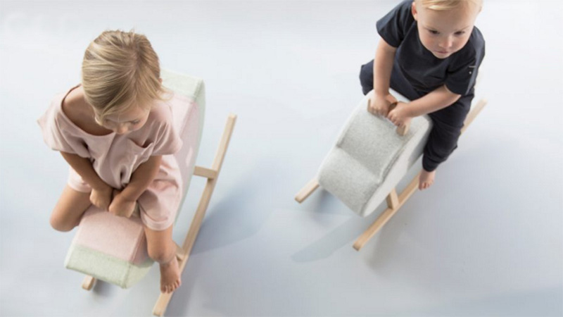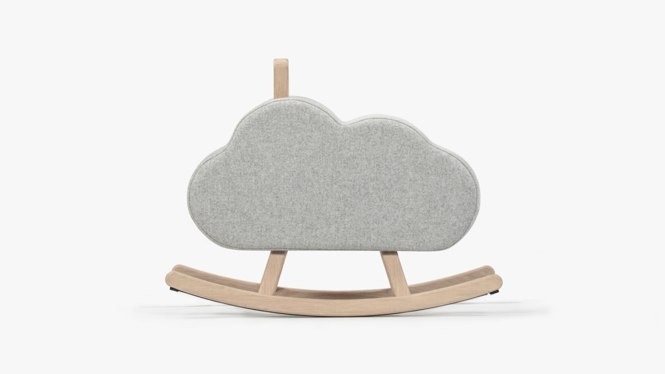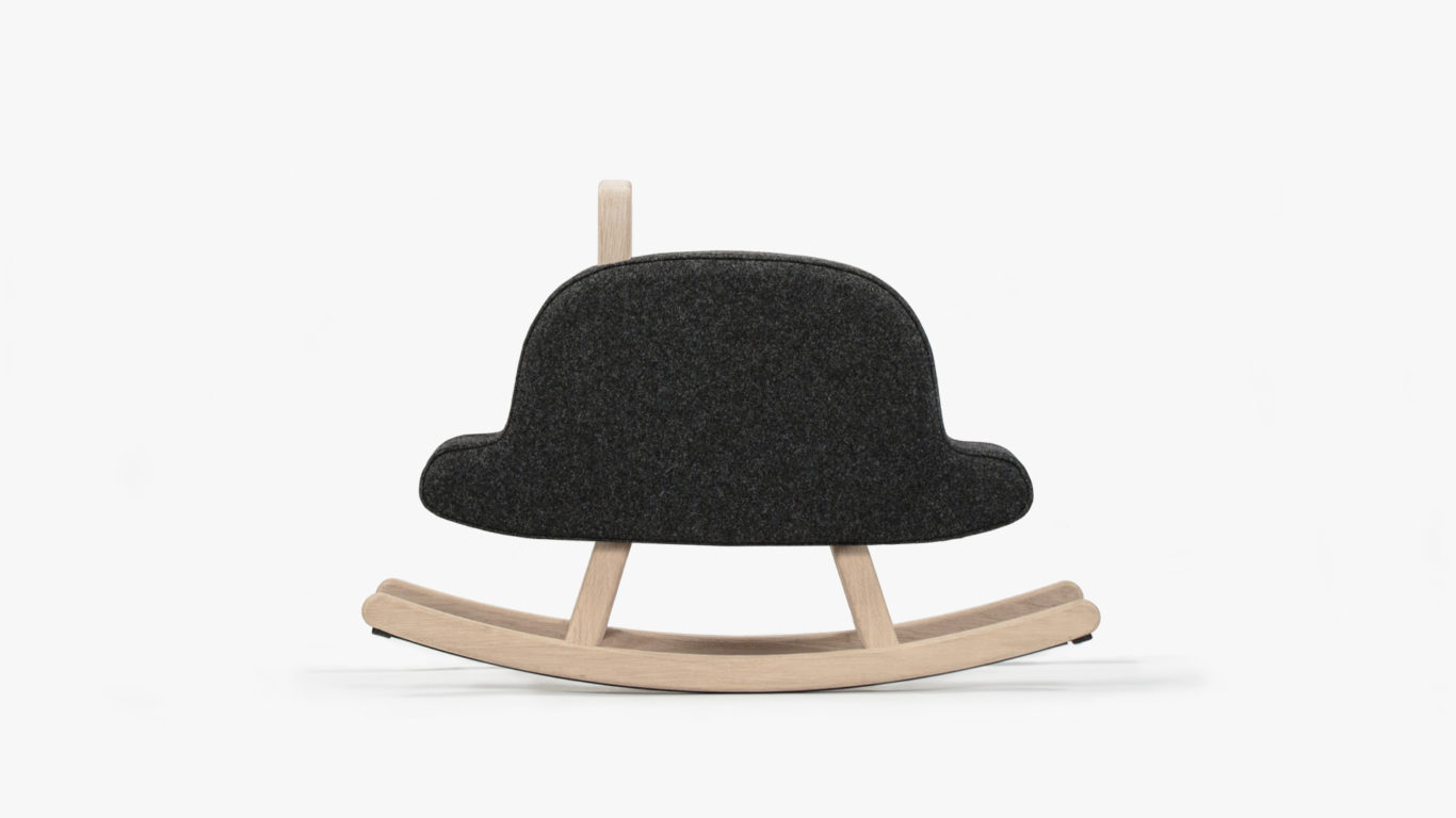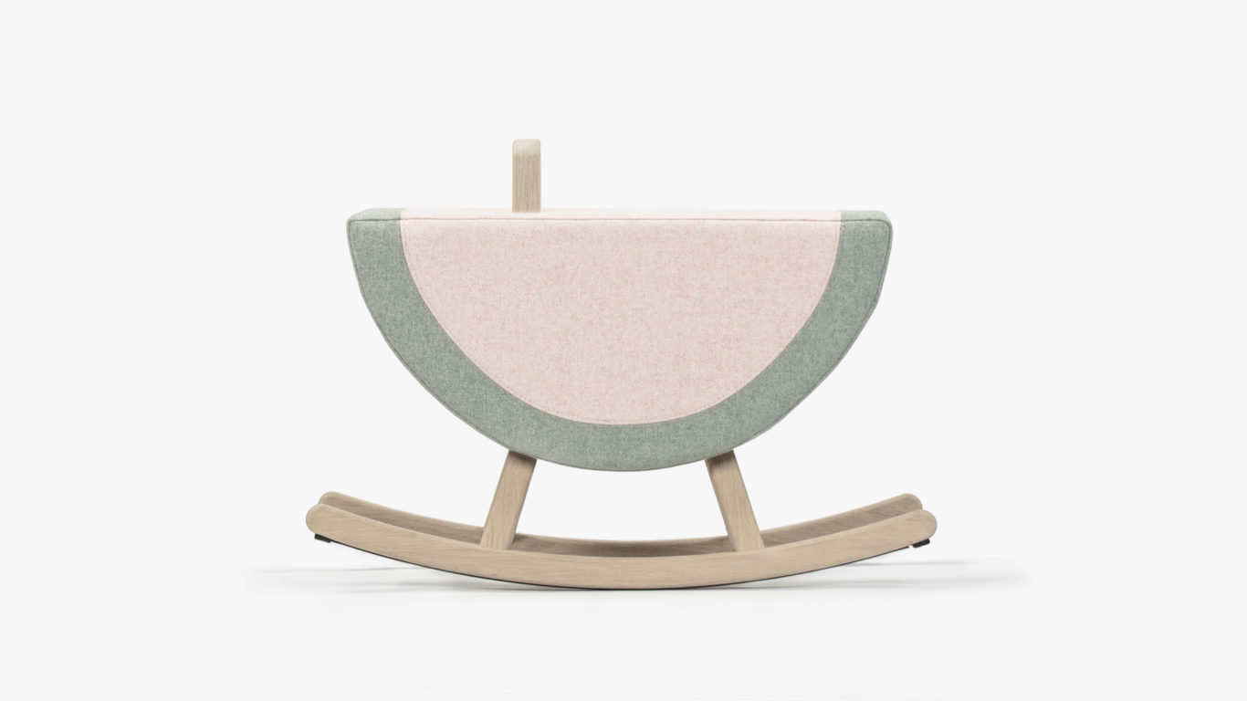 Maison Deux propose des fauteuils à bascule au design minimaliste. Ici, pas question de cheval mais de nuage, chapeau melon et pastèque !