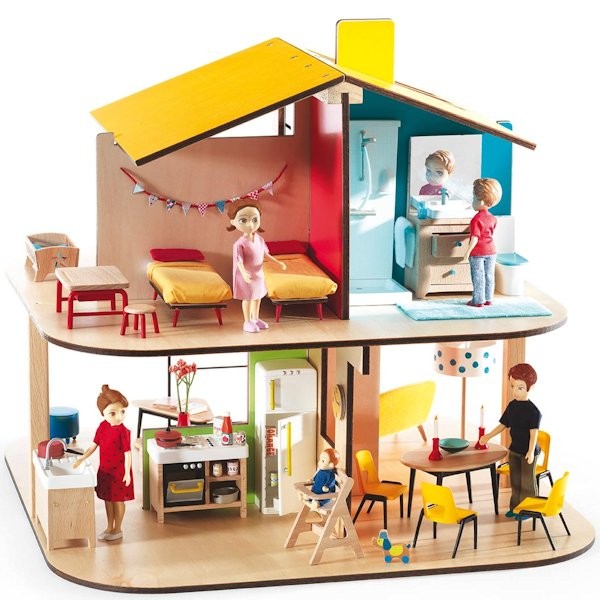 Djeco nous livre sa vision de la maison de poupées en bois: le résultat est superbe ! Avec un design qui nous rappelle les années 60-70, ou encore le célèbre dessin animé des Indestructibles. La maison de poupées colorée comporte 7 pièces. Chacune est décorée d’une couleur vive qui met bien en valeur le mobilier. La jouabilité est exceptionnelle pour une maison de poupées puisque toutes les pièces sont ouvertes sur l’extérieur promettant ainsi un accès maximum pour que plusieurs enfants puissent y jouer en même temps.